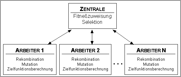 Die Berechnungen, für welche die gesamte Population benötigt wird - Selektion und Fitneßzuweisung - werden von einer Zentrale ausgeführt. Die restlichen Berechnungen, die jeweils nur ein oder zwei (mehrere) Individuen gleichzeitig verwenden, werden jeweils an einen der vielen gleichartigen Arbeiter verschickt, die jeder für sich und parallel zueinander die Rekombination, Mutation und Zielfunktionsberechnung durchführen (bekannt als synchrone Master-Slave-Struktur, siehe Abbildung 4-2). Da diese Berechnungen parallel von mehreren Rechnern ausgeführt werden, läßt sich eine fast lineare Beschleunigung der Gesamtberechnung erzielen.