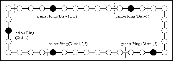 Abbildung 4-8: Lineare Nachbarschaftstopologien: ganzer und halber Ring mit unterschiedlicher Distanz