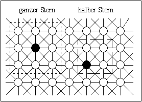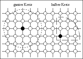 Abbildung 4-10: Zweidimensionale Nachbarschaftstopologien; links: ganzer und halber schiefer Stern mit einer max. Distanz von 2, rechts: ganzer und halber Kreis mit einer max. Distanz von