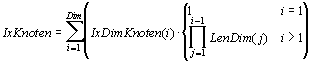 Der Index eines Knoten in der eindimensionalen Indexierung, IxKnoten, läßt sich aus seiner mehrdimensionalen Indexierung, IxDimKnoten, ermitteln. IxDimKnoten ist ein Vektor der Länge Dim.