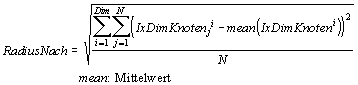 Durch Verwendung aller Knoten einer Anordnung in Gleichung 4-8 läßt sich der Radius einer Anordnung RadiusAnord berechnen. Der Quotient aus RadiusNach und RadiusAnord (Radienquotient) ist eine Maßzahl, die zum Vergleich einiger Anordnungen und Nachbarschaften untereinander verwendet werden kann.