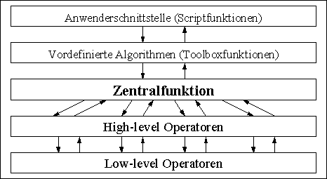 Im Mittelpunkt steht eine Zentralfunktion. Auf diese Funktion wird von außen über die Anwenderschnittstelle (Scriptfunktionen) zugegriffen. Eine Zwischenschicht enthält vordefinierte Algorithmen (Toolboxfunktionen). Die Zentralfunktion ruft alle benötigten evolutionären Operatoren auf. Dieser Aufruf der evolutionären Operatoren erfolgt über zwei Schichten. Außerdem übernimmt die Zentralfunktion den größten Teil der Verwaltungsarbeit und führt verschiedene Auswertungen durch.