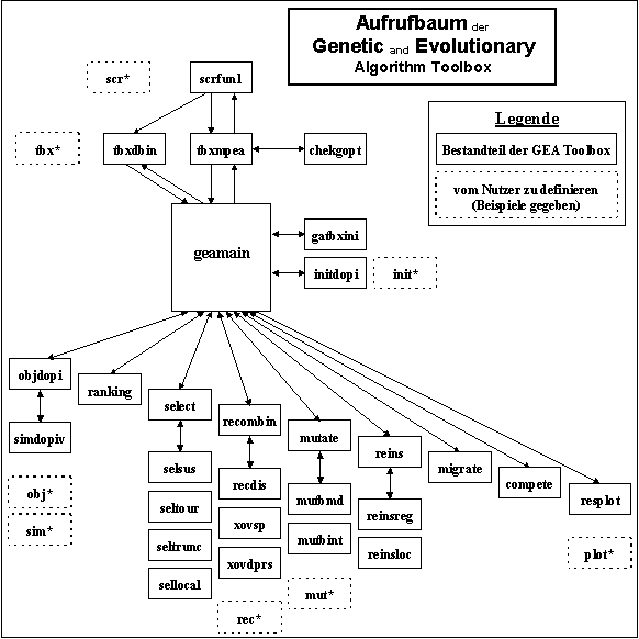 Dieses Schichtenmodell, das in Abbildung 6-1 abstrahiert gezeigt ist, soll im folgenden weiter untersetzt werden. Abbildung 6-2 zeigt die Struktur der GEA Toolbox unter Verwendung der Namen der entsprechenden Matlab-Funktionen detaillierter. Auch aus dieser Abbildung ist das Schichtenmodell gut zu erkennen. Mittelpunkt ist die Zentralfunktion geamain. Der Aufruf von geamain erfolgt über die Initialisierungsfunktionen, die zweischichtig ausgeführt sind (scr* und tbx*). Die Zentralfunktion selbst ruft die evolutionären Operatoren auf, auch dieser Aufruf ist zweischichtig strukturiert.