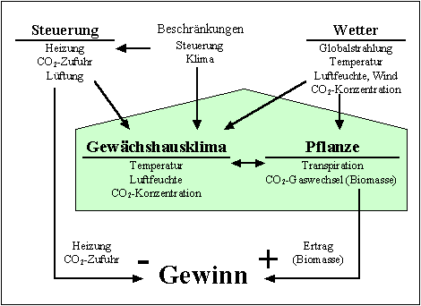 Die Effektivität der Pflanzenproduktion im Gewächshaus hängt entscheidend von der Einstellung optimaler klimatischer Wachstumsbedingungen zur Erzielung hoher Erträge bei niedrigem Aufwand, guter Qualität und geringer Umweltbelastung ab. Um dies zu erreichen, müssen gleichzeitig mehrere Einflußgrößen wie Temperatur, Luftfeuchte und CO2-Konzentration in jedem Zeitpunkt entsprechend vorgegebener Kriterien durch Heizen, Lüften, CO2-Zufuhr u.a. optimal gesteuert werden. Da dieser sich ständig ändernde optimale Zustand in der gesamten Vegetationsperiode einzuhalten ist, ergibt sich eine hochdimensionale Optimierungsaufgabe.