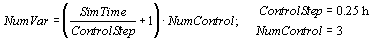 Die Steuerungen werden zu äquidistanten Zeitpunkten diskretisiert. Für die Simulation wird ein Halteglied 1. Ordnung verwendet, um Werte der Steuerungsgrößen zwischen den Diskretisierungspunkten zu erhalten. Die Anzahl der Variablen kann mittels Gl. 7-1 berechnet werden: