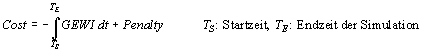 Die im Modell verwendete Zielfunktion, Cost, Gleichung 7-2, dient zur Maximierung des Gewinns, Gleichung A3-6, unter der Bedingung der Erfüllung der Beschränkungen, siehe Abschnitt A.3.4, S.. Um die Einhaltung der Beschränkungen zu erreichen, wird den Individuen bei Verletzung der Beschränkungen ein Bestrafungswert (Penalty) zugewiesen. Da bei der Optimierung mit einer Minimierung gearbeitet wird, muß in Gleichung 7-2 der Gewinn mit -1 multipliziert werden.
