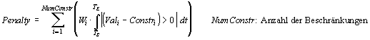Für die Bestrafungsfunktion Penalty, Gleichung 7-3, kommt eine gewichtete Summe zur Anwendung. Val entspricht entweder einer der Zustandsvariablen des Gewächshausklimas oder einer der Steuerungsgrößen. Constr ist die jeweils dazugehörende Beschränkung. Durch Wahl der Gewichte W kann die Wichtigkeit der Einhaltung dieser Beschränkung definiert werden.