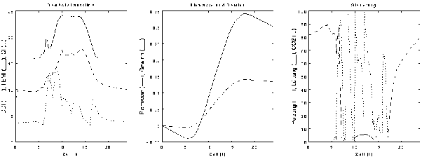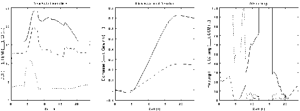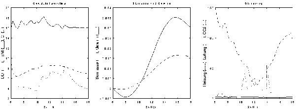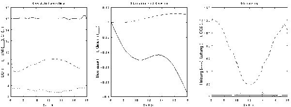 Das jeweils linke Diagramm der Abbildungen 7-4 - 7-7 zeigt die Verläufe der Zustandsvariablen des Gewächshauses: Luftfeuchtigkeit, DDI, Gleichung A3-2, Temperatur, TEMI, Gleichung A3-1, und CO2-Konzentration, CI, Gleichung A3-3. Die CO2-Konzentration wurde zur Skalierung auf den Wertebereich der anderen beiden Variablen durch 100 dividiert. Die Verläufe von Biomasse, BIOM, und Gewinn, GEWI, Gleichung A3-6, sind jeweils im mittleren Diagramm der oben genannten Abbildungen dargestellt (summiert über die Zeit - cumulative sum). Die Biomasse wurde durch 100 dividiert, um mit dem Gewinn in einem Diagramm dargestellt werden zu können. Das jeweils rechte Diagramm zeigt die Verläufe der 3 Stellgrößen: Heizung, Q, Lüftung, LR und CO2-Zufuhr, W, wobei die Werte der CO2-Zufuhr mit 10 multipliziert wurden.