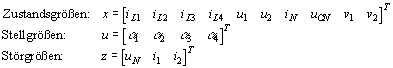 Das System wurde durch zwei weitere Zustände v1 und v2 (Integral der Abweichung der Ausgangsspannungen u1 und u2 von ihren Referenzwerten u10 und u20) erweitert, so daß ein System 10. Ordnung vorliegt. Daraus ergeben sich die folgenden Vektoren für Zustands-, Stell- und Störgrößen: