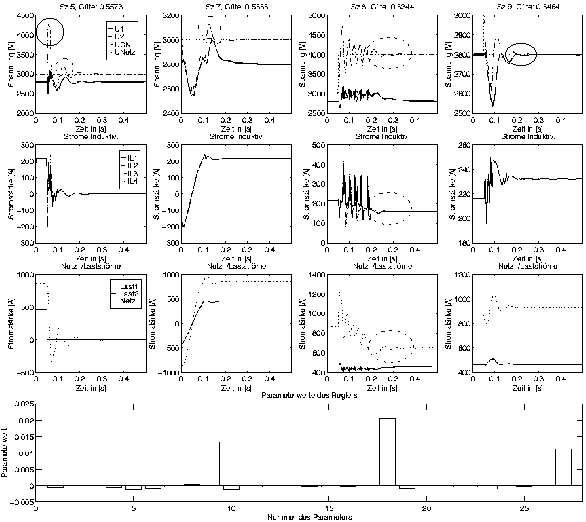 Wird dagegen ein Vergleich mit den Gütewerten der optimierten linearen Zustandsrückführungen einfach und dreifach durchgeführt, dann sehen die Ergebnisse nicht mehr so positiv aus. Die Ergebnisse der optimierten linearen Zustandsrückführung einfach liegen in derselben Größenordnung, wie die optimierte quadratische Zustandsrückführung. Die Simulationsergebnisse sind denen der optimierten linearen Zustandsrückführung einfach in Abbildung 7-14 sehr ähnlich, eine Verbesserung ist nicht zu erkennen. Ein Blick auf den linearen Teil der Parameter beider Zustandsrückführungen zeigt, daß diese Werte für beide Ergebnisse fast identisch sind.