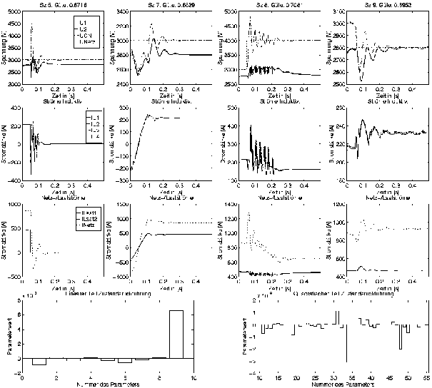 Bei Szenario 5 und 7 sind die Ausschläge von UCN geringer. Signifikantere Unterschiede sind in Szenario 8 zu erkennen. In allen 3 Grafiken für Szenario 8 ist zu erkennen, daß die Schwingungen des Systems nach 0.25s beendet sind. Bei der Verwendung der Standardlösung geschah dies erst nach 0.4s. In Szenario 9 kehren die Werte für U1 und U2 nach 0.25s auf den geforderten Wert von 2800V zurück. Mit der Standardlösung konnte dies erst nach 0.4s erreicht werden. Dafür ist in Szenario 9 der positive Maximalwert des Lastströme IL1-IL4 etwas höher.