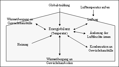 Die Zustände des Gewächshausklimas sind zur Vermeidung von Streß für die Pflanzen und zur Einhaltung von Randbedingungen, die sich aus langfristigen Strategien ergeben, beschränkt. Vorgenommen wird eine Beschränkung der Temperatur im Gewächshaus.