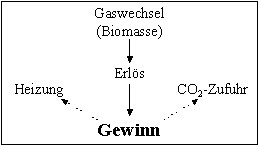 Die Biomasse, BIOM, ist die aus dem CO2-Gaswechsel der Pflanzen, gaweblfl, berechnete Trockensubstanzproduktion, die durch Multiplikation mit dem Anteil am Ertrag (50%) und durch Division mit dem Trockensubstanzgehalt (5%) in eine Ertragsgröße, Ertrag, und nachfolgend durch Multiplikation mit dem Gemüsepreis in eine Erlösgröße, GEWINN, umgerechnet wird. Die Kosten für die CO2-Zufuhr werden aus dem CO2-Preis errechnet. Analog erfolgt die Berechnung der Kosten der Wärmezufuhr durch Heizen über den Energiepreis für Heizöl.